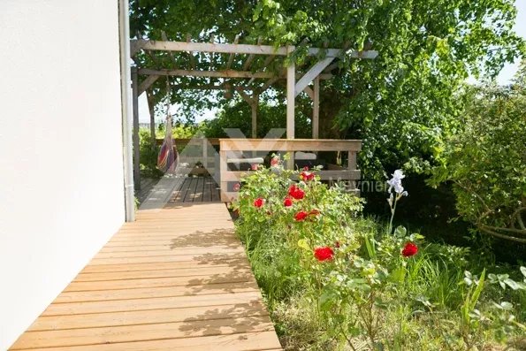 Un terrain de 1726m² joliment arboré, terrasse en bois avec pergola et un abri jardin. Un atelier attenant à la maison de 17m².